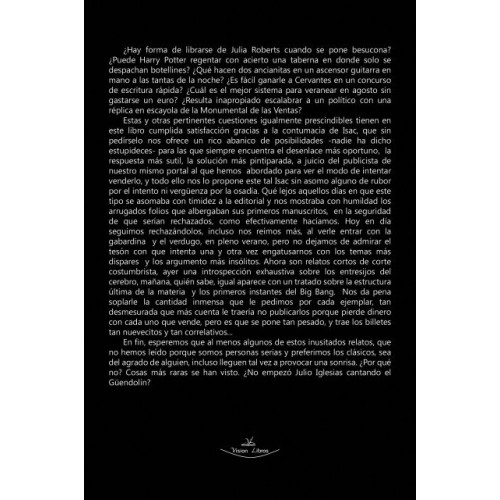 ¿Hay forma de librarse de Julia Roberts cuando se pone besucona? ¿Puede Harry Potter regentar con acierto una taberna en donde solo se despachan botellines? ¿Qué hacen dos ancianitas en un ascensor guitarra en mano a las tantas de la noche? ¿Es fácil ganarle a Cervantes en un concurso de escritura rápida? ¿Cuál es el mejor sistema para veranear en agosto sin gastarse un euro? ¿Resulta inapropiado escalabrar a un político con una réplica en escayola de la Monumental" de las Ventas?. Estas y otras pertinentes cuestiones igualmente prescindibles tienen en este libro cumplida satisfacción gracias a la contumacia de Isac, que sin pedírselo nos ofrece un rico abanico de posibilidades -nadie ha dicho estupideces- para las que siempre encuentra el desenlace más oportuno , la respuesta más sutil, la solución más pintiparada, a juicio del publicista de nuestro mismo portal al que hemos abordado para ver el modo de intentar venderlo, y todo ello nos lo propone este tal Isac sin asomo alguno de rubor por el intento ni vergüenza por la osadía. Qué lejos aquellos días en que este tipo se asomaba con timidez a la editorial y nos mostraba con humildad los arrugados folios que albergaban sus primeros manuscritos, en la seguridad de que serían rechazados, como efectivamente hacíamos. Hoy en día seguimos rechazándolos, incluso nos reímos más, al verle entrar con la gabardina y el verdugo, en pleno verano, pero no dejamos de admirar el tesón con que intenta una y otra vez engatusarnos con los temas más dispares y los argumento más insólitos. Ahora son relatos cortos de corte costumbrista, ayer una introspección exhaustiva sobre los entresijos del cerebro, mañana, quién sabe, igual aparece con un tratado sobre la estructura última de la materia y los primeros instantes del Big Bang. Nos da pena soplarle la cantidad inmensa que le pedimos por cada ejemplar, tan desmesurada que más cuenta le traería no publicarlos porque pierde dinero con cada uno que vende, pero es que se pone tan pesado, y trae los billetes tan nuevecitos y tan correlativos... En fin, esperemos que al menos algunos de estos inusitados relatos, que no hemos leído porque somos personas serias y preferimos los clásicos, sea del agrado de alguien, incluso lleguen tal vez a provocar una sonrisa. ¿Por qué no? Cosas más raras se han visto. ¿No empezó Julio Iglesias cantando el Güendolín?